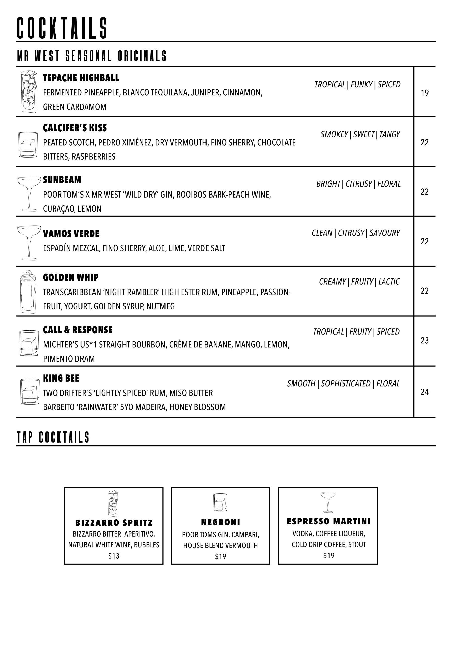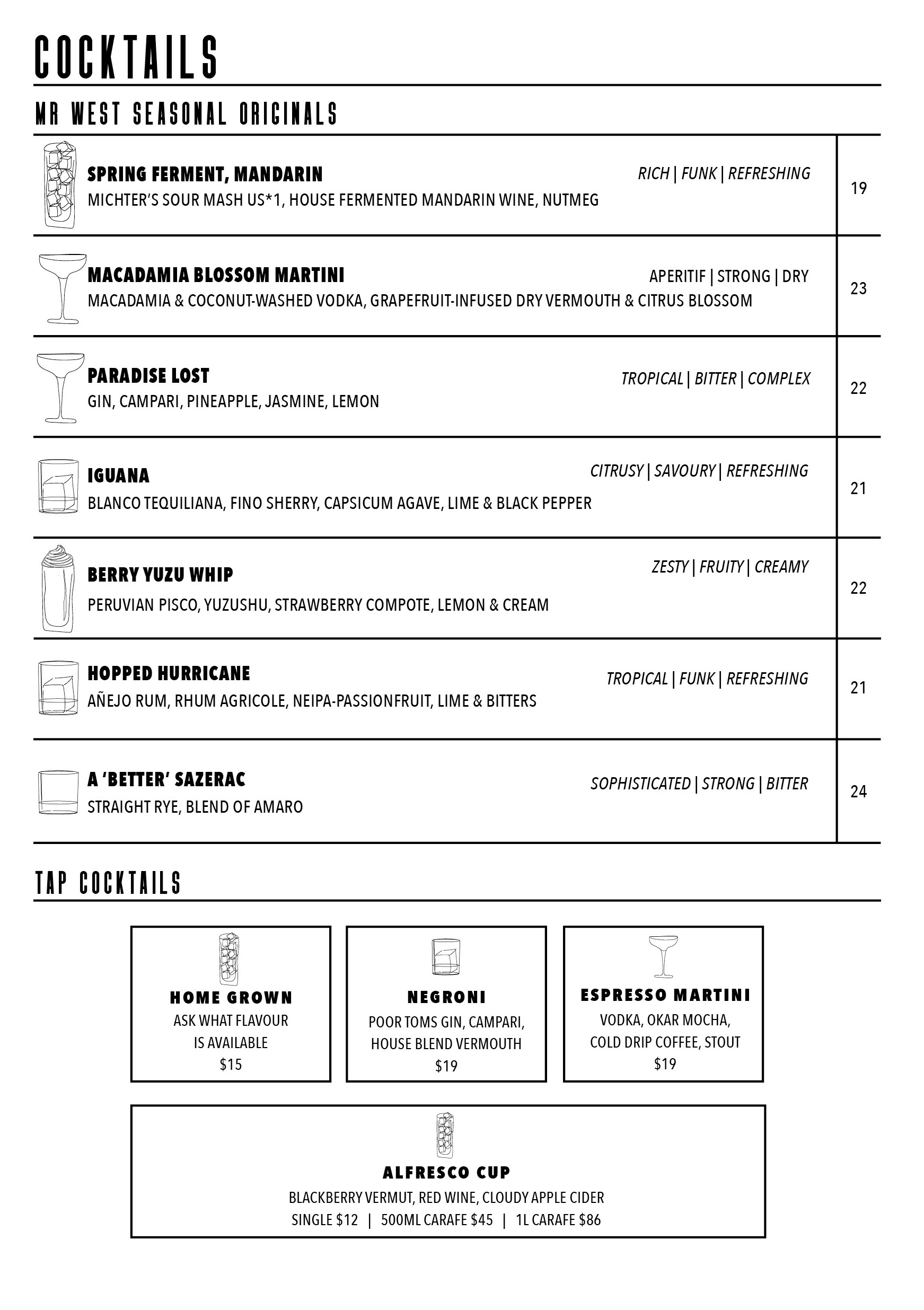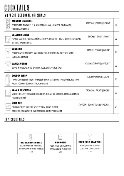 Welcome to our vibrant menu for Mr West Bar in Footscray, where we proudly offer an exceptional selection of natural wines, craft beers, and artisanal spirits. As the best cocktail bar in Footscray, we curate an enticing menu that is sure to captivate your taste buds and elevate your drinking experience.