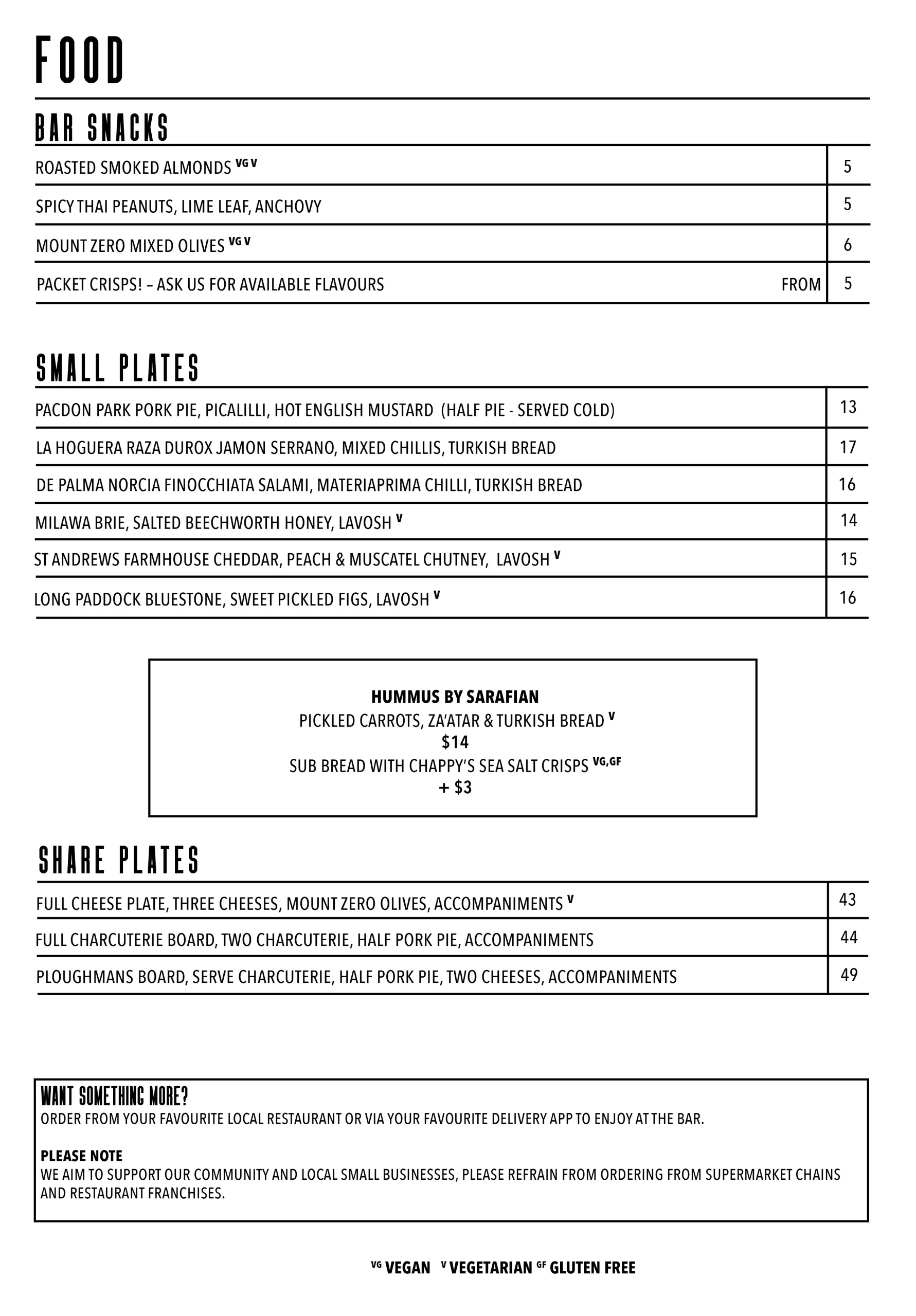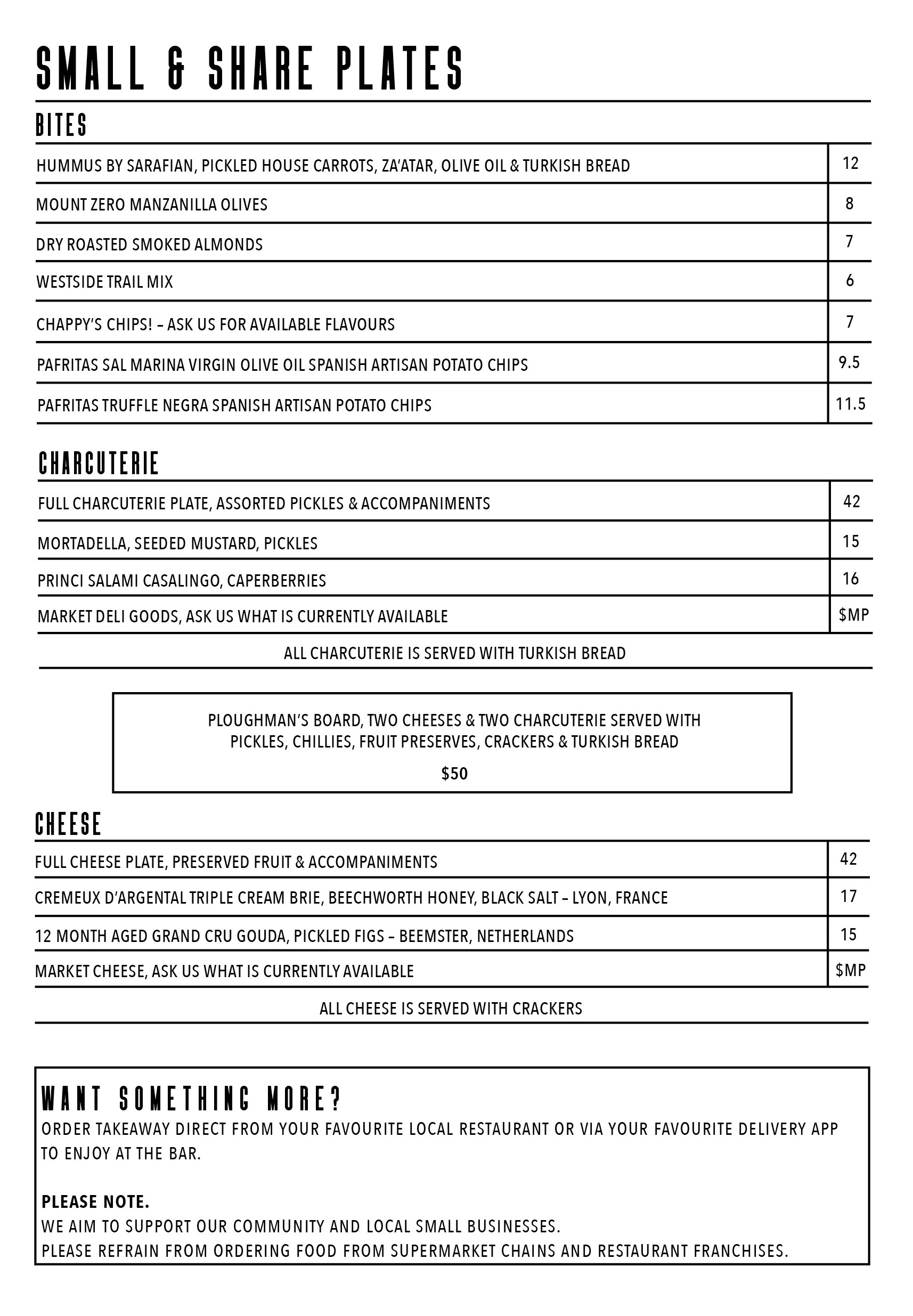 Indulge in the perfect pairing with our delectable small eats menu, expertly crafted to complement your chosen libation. Should you desire a more substantial dining experience, we gladly invite you to order from the diverse range of local takeaway restaurants through your preferred food delivery app.