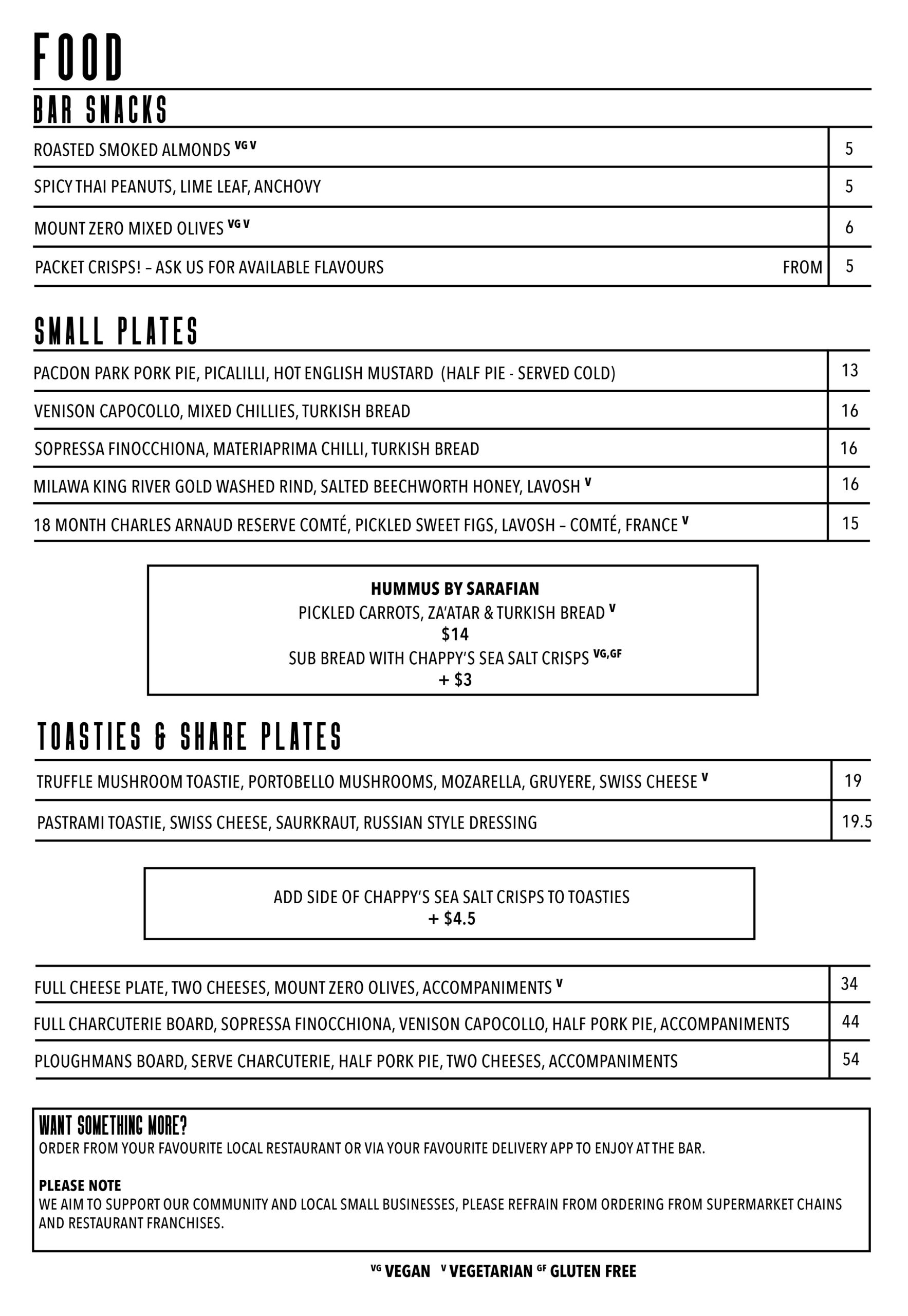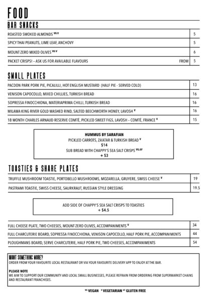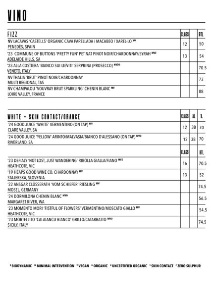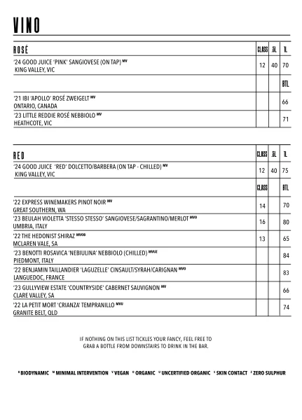 Please note that our menu may change periodically to ensure a fresh and exciting experience. Allow us to be your destination for natural wine, craft beer, artisanal spirits, and unforgettable cocktails in Footscray.