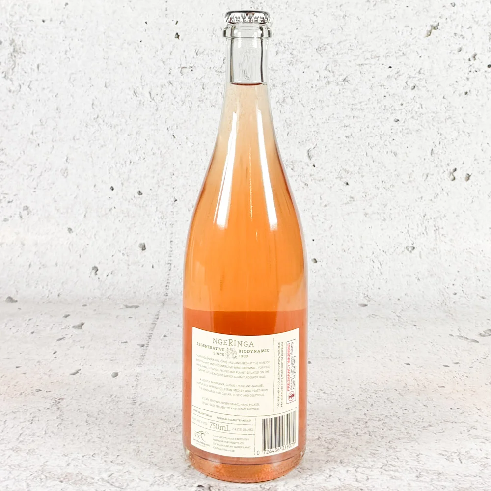 A blend of Viognier and Pink Semillon with some skin contact and Syrah Rose from all three of our vineyards. Also in the mix is some early picked Pinot Noir and Sangiovese from the Turnbull vineyard that was whole bunch pressed and Pinot were picked relatively early for freshness and acidity.  Once nearly dry the above components were blended and sweetened with some frozen juice before being bottled in the early June 2023. Fermentation finished in the bottle resulting in a light bubbly sparkling. No enzymes, no fining, no filtration or anything added to this wine. This lightly bubbly Rosé has a delicious nose of exotic flowers and musk, pithy grapefruit, blood orange and distinctive peaches. On the palate, there is a mixed fruit salad experience that is light, refreshingly fruity, with a dry, textured finish. – Ngeringa Wines