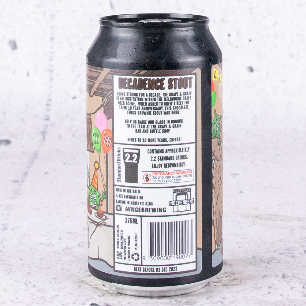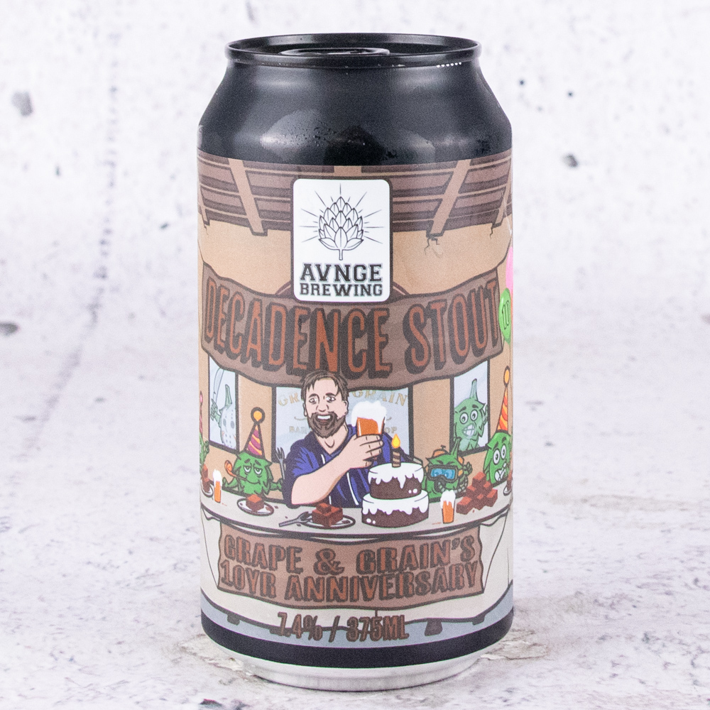 Going strong for a decade, the Grape & Grain is an institution within the Melbourne craft beer scene. When asked to brew a beer for their 10 year anniversary, this Chocolate Fudge Brownie Stout was born. Help us raise our glass in honour to the team at the Grape & Grain Bar and Bottle Shop. – Avnge Brewing