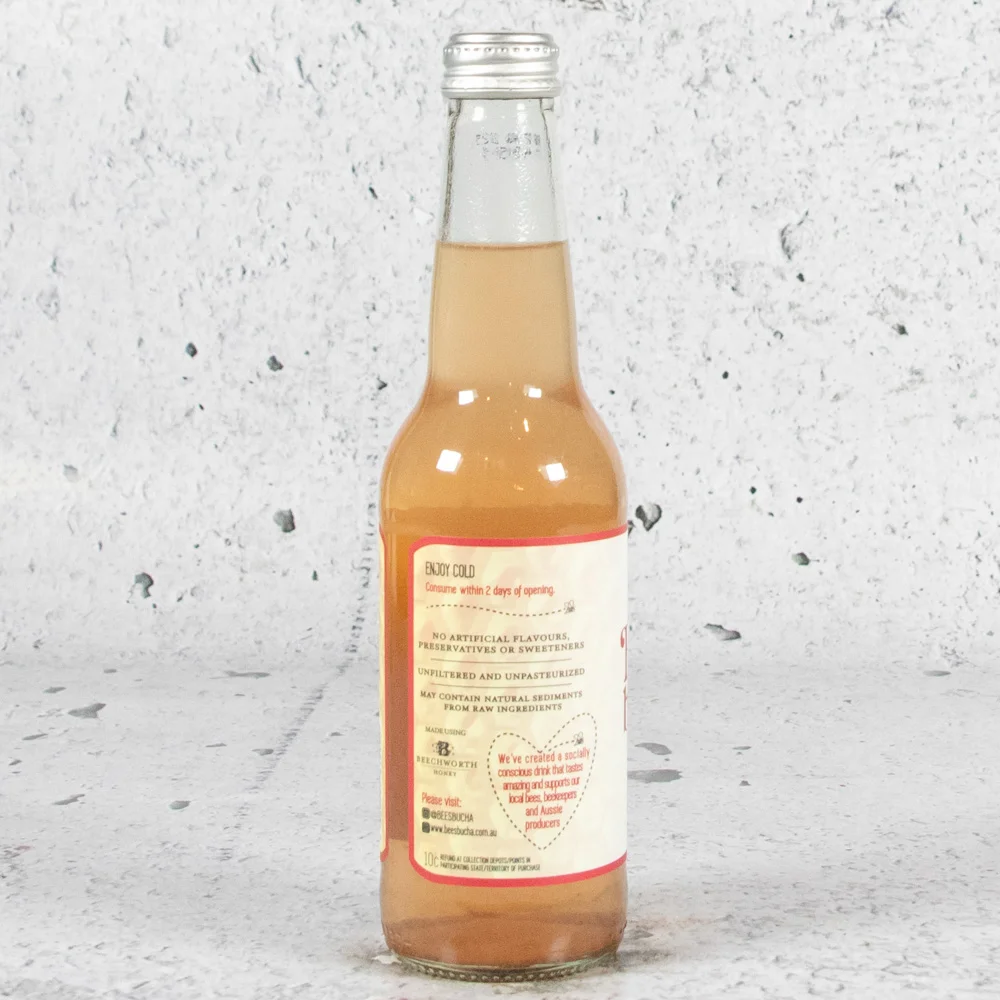 Ingredients: No artificial flavours, preservatives or sweeteners. Just water, Beechworth Honey, raspberries and wild eucalyptus radiata, native from South Eastern Australia. 100% natural, unfiltered, unpasteurized, no preservative, no artificial flavour or sweetener. – Beesbucha