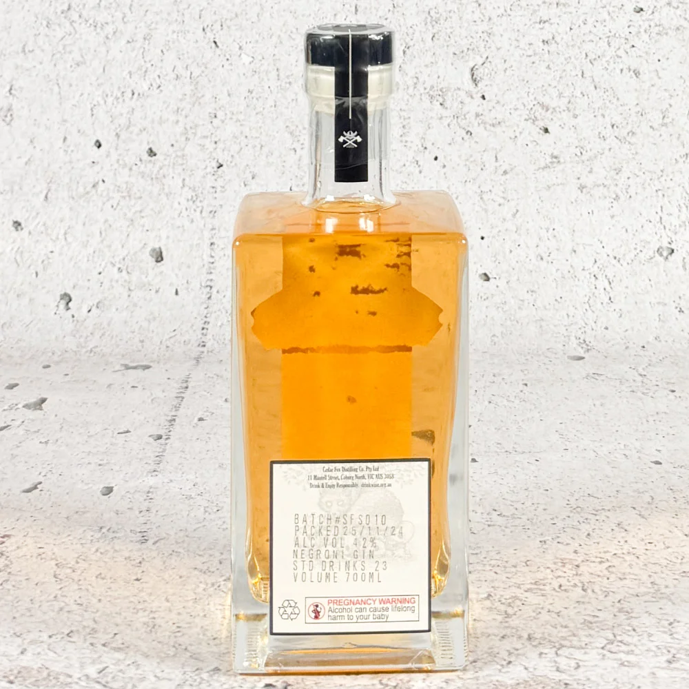 We started with a small American oak barrel that had previously held whisky. This barrel was then filled with Negroni, using Marionette Bitter Curacao, Maidenii Vermouth, and Cedar Fox Gin, to create an oak-aged Negroni served at our cellar door. Once the Negroni was finished, we refilled the barrel multiple times with Cedar Fox Gin, allowing it to soak up the Negroni and oak flavors. The result is an unfiltered, deliciously flavored gin that’s perfect neat, in a cocktail, or on the rocks with a slice of orange, an ideal summer sipper! – Cedar Fox