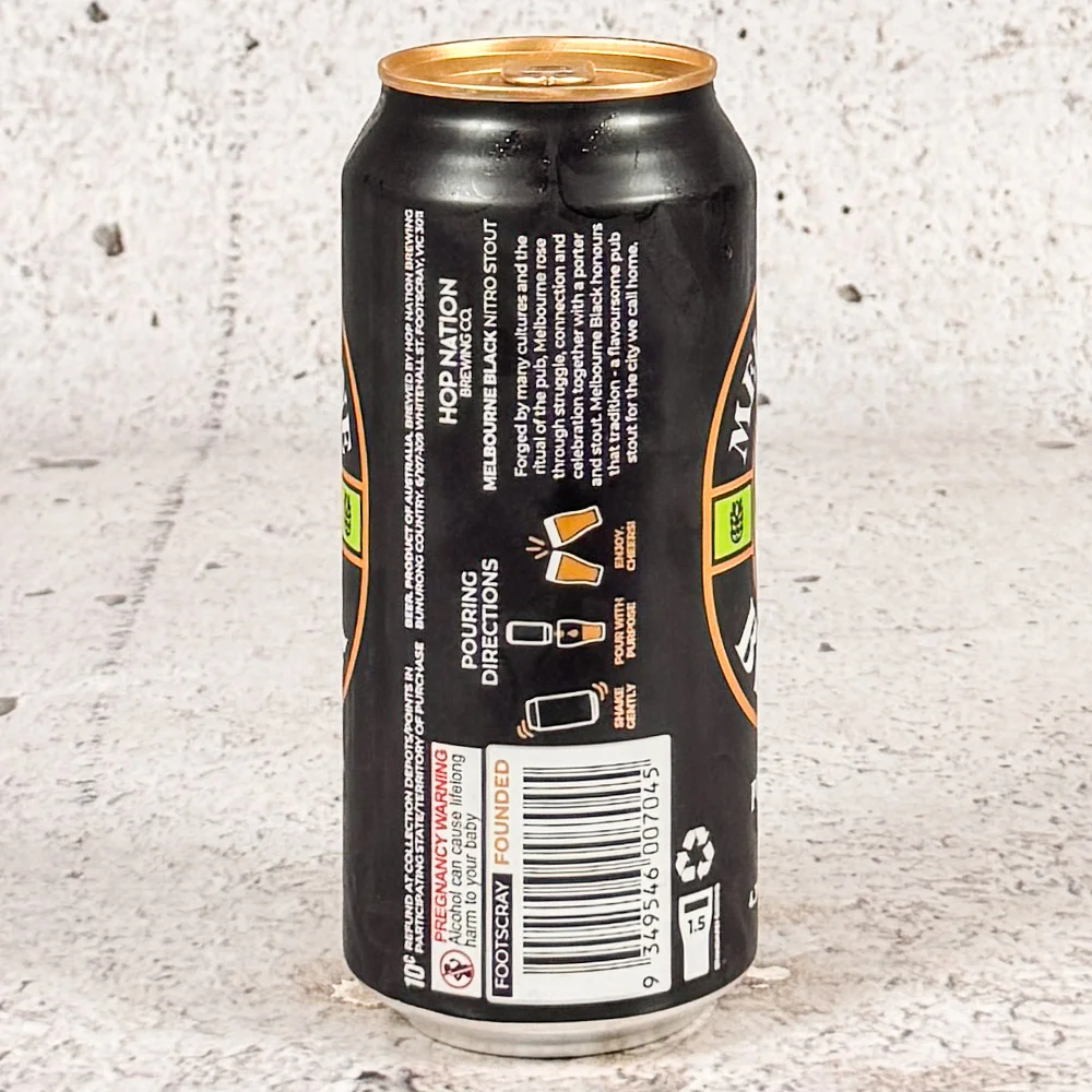 Forged by many cultures and the ritual of the pub, Melbourne rose through struggle, connection and celebration together with a porter and stout. Melbourne Black honours that tradition — a flavoursome pub stout for the city we call home. – Hop Nation