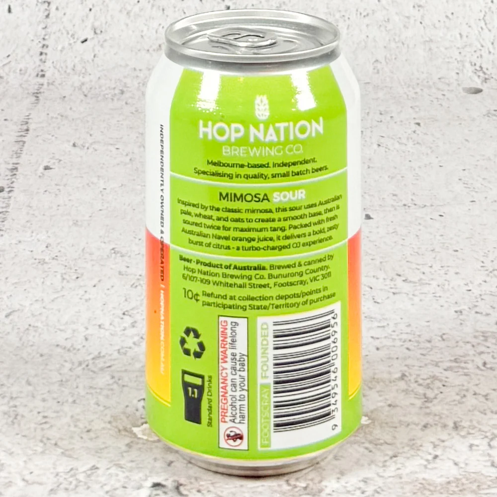 Inspired by the classic mimosa, this sour uses Australian pale, wheat, and oats to create a smooth base, then is soured twice for maximum tang. Packed with fresh Australian Navel orange juice, it delivers a bold, zesty burst of citrus — a turbo-charged OJ experience. – Hop Nation