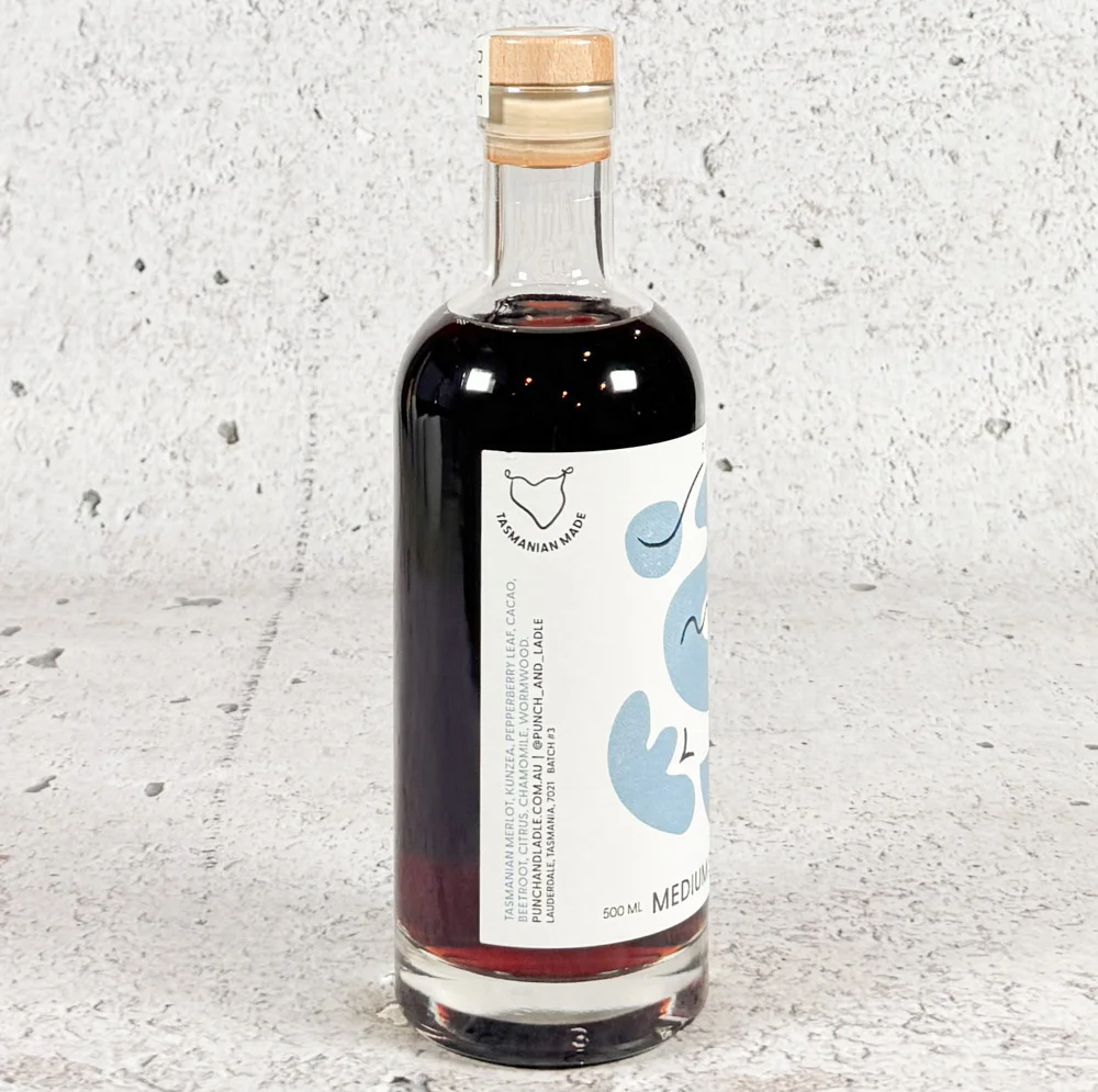 A punchy native vermouth, with a base of Tasmanian red wine, infused with kunzea, pepperberry leaf, chamonmile, beetroot, cacao nibs and wormwood.