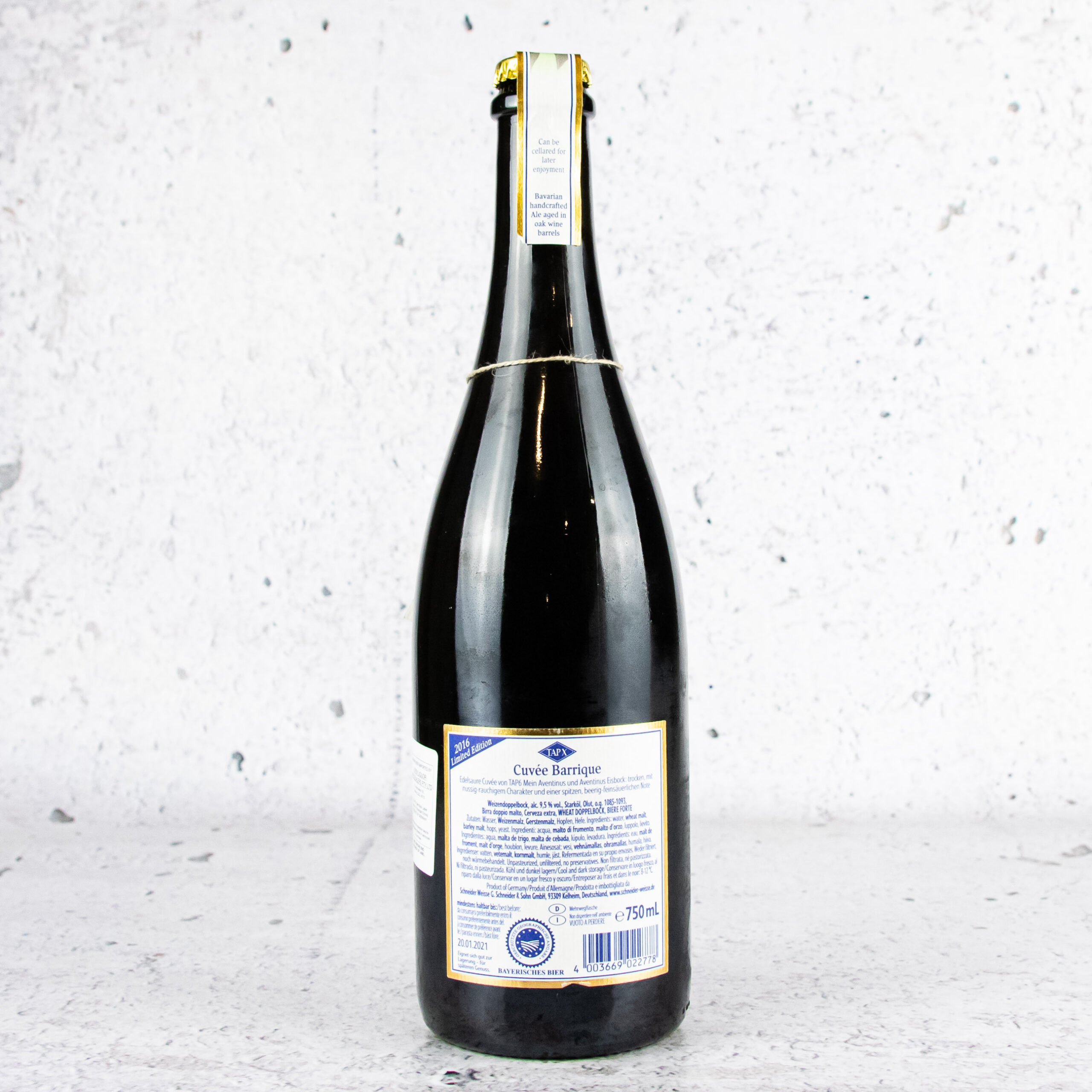 Matured for several months in oak barrels, this cuvée of TAP6 Unser Aventinus and Aventinus Eisbock offers new dimensions for pioneers of enjoyment: dry, with a nutty, smoky character, on your palate a wonderful balance of elegantly toasting flavour combined with toffee and paired with tart berry-like sour notes.